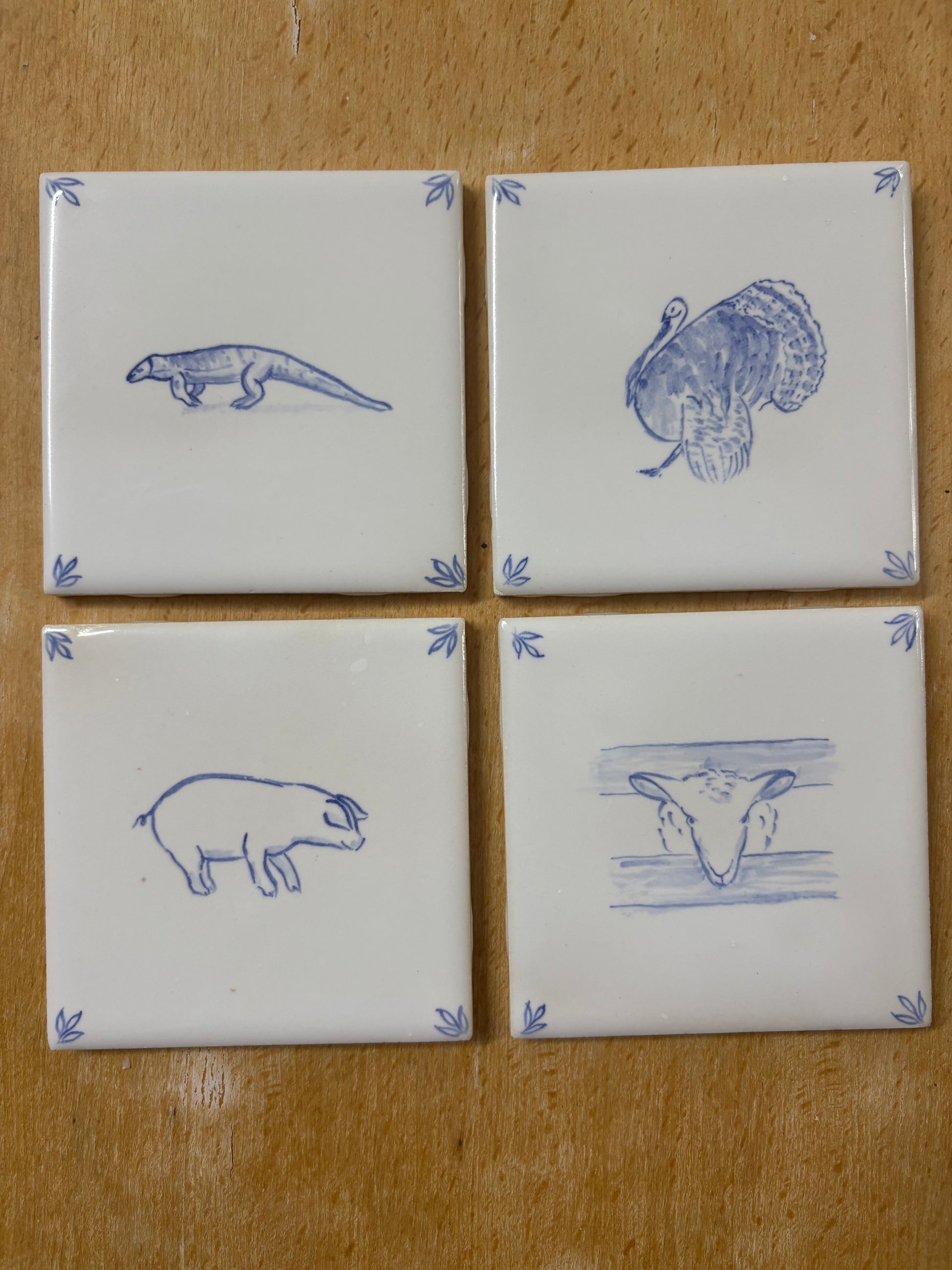 Set of 135 hand painted 4.25" tiles, being 67 with images, and 68 blank with painted corners.